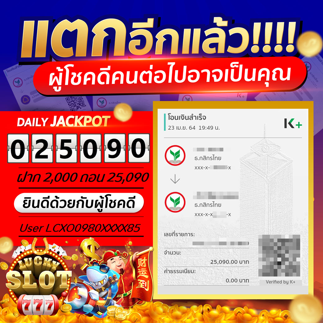 Jackpot วันที่ 23 เม.ย. 64 ยูส LCXO0980XXXX85 ฝาก 2,000 ถอน 25,060