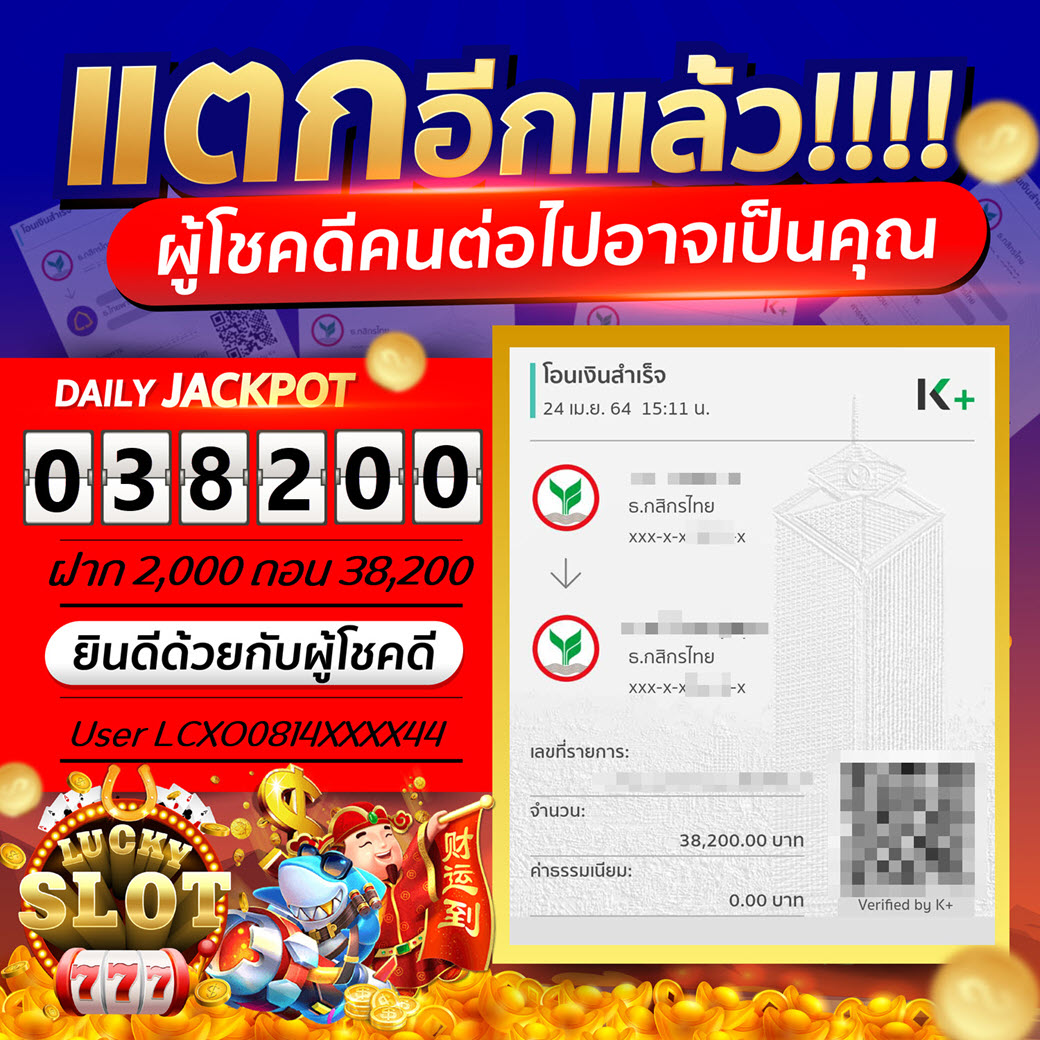Jackpot วันที่ 24 เม.ย. 64 ยูส LCXO0814XXXX44 ฝาก 2,000 ถอน 38,200