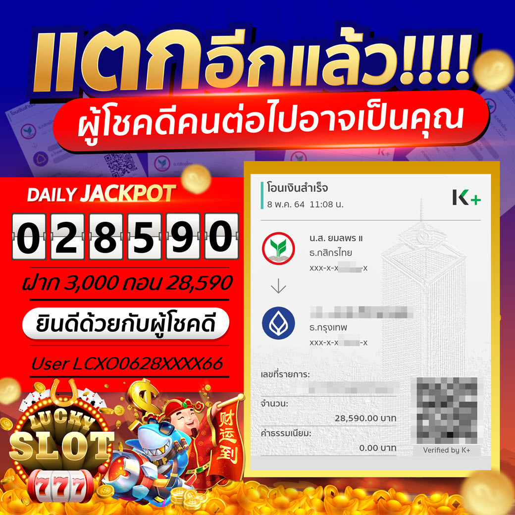 Jackpot วันที่ 8 พ.ค. 64 ยูส LCXO06288XXXX66 ฝาก 3,000 ถอน 28,590