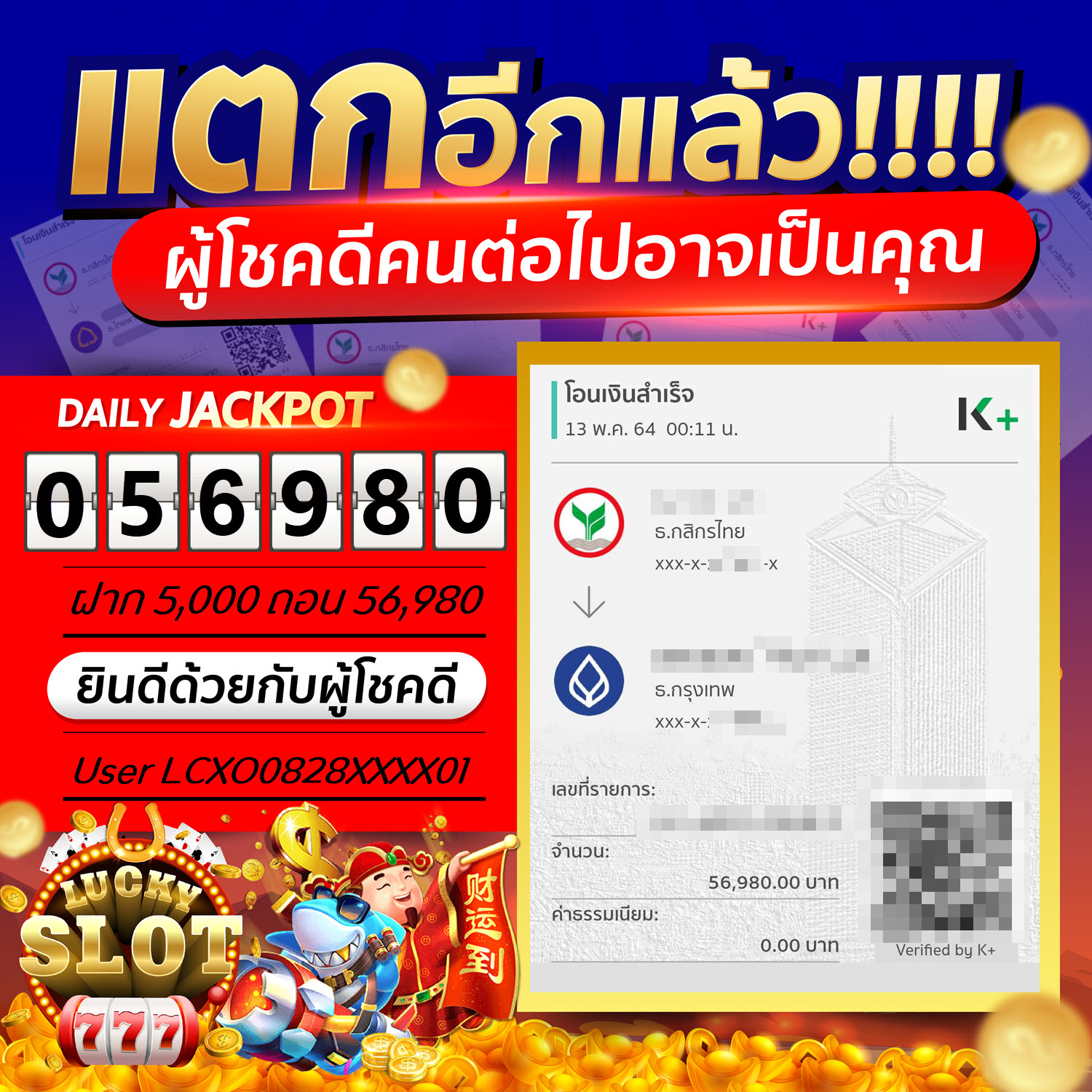 Jackpot วันที่ 13 พ.ค. 64 ยูส LCXO0828XXXX01 ฝาก 5,000 ถอน 56,980
