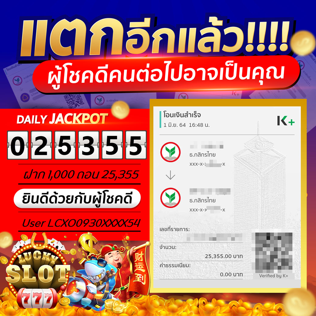 Jackpot วันที่ 1 มิ.ย. 64 ยูส LCXO0930XXXX54 ฝาก 1,000 ถอน 25,355